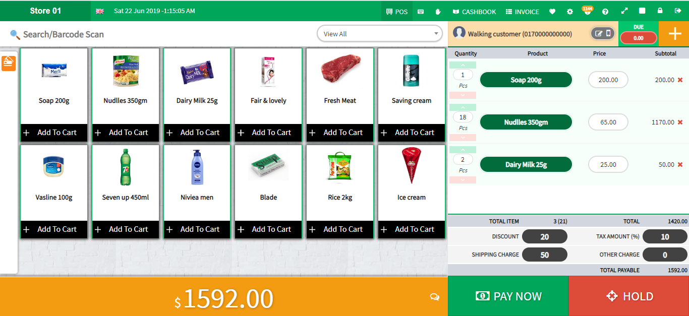 - Then click on the product from the product list window(click many times or you can type in quantity, if you want to add more product)